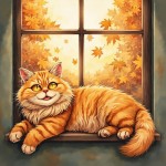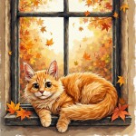 Cartoon Fluffy Cat on Windowsill with Autumn Background