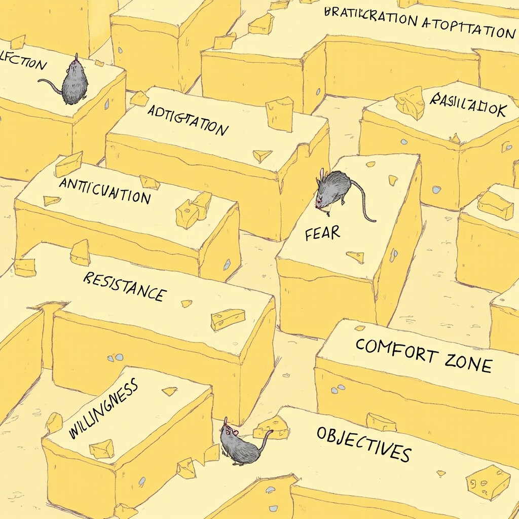 deseo generar una infografía basado en el libro "quien se ha llevado mi queso" que represente el laberinto recorrido por los personajes y que a su vez en las paredes tengan escritas las siguientes palabras: Reflexión, Adaptación, Anticipación, Convicciones, Miedo, Resistencia, Zona de confort, Disposición, Cambios, Objetivos. que se vean quesitos, y la colita de uno de los ratones