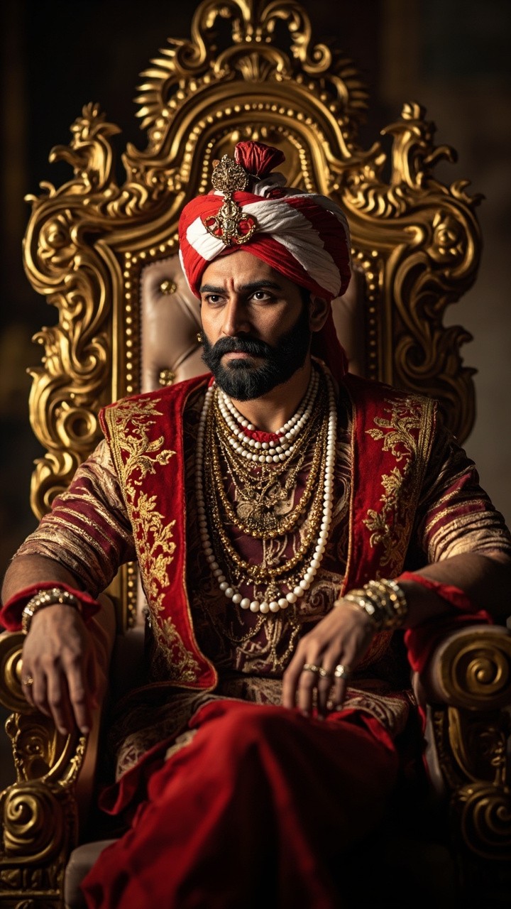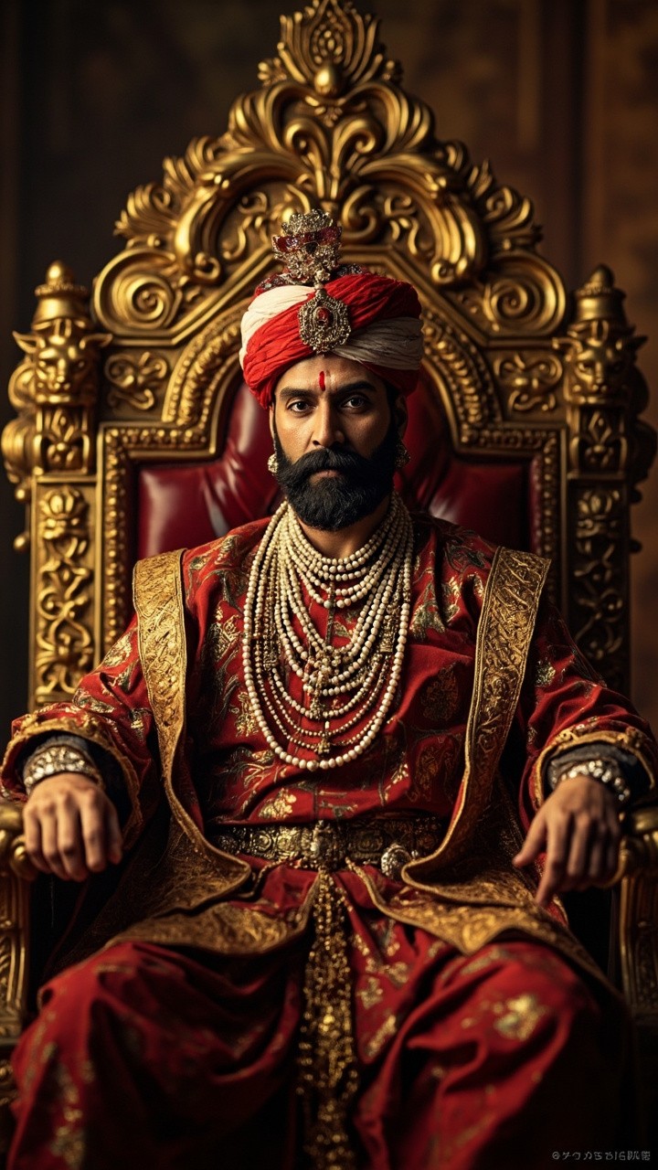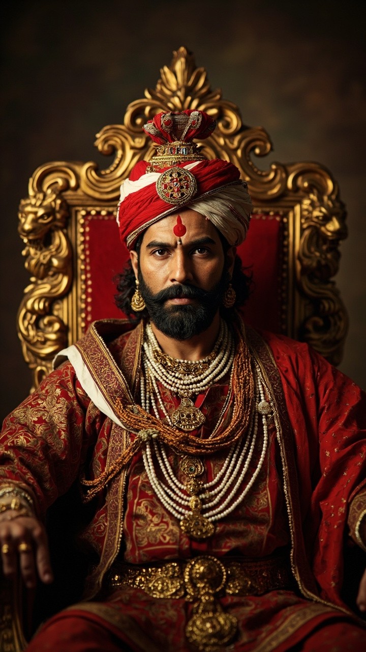 “Ultra-realistic royal portrait of Chhatrapati Shivaji Maharaj sitting on a majestic golden throne, detailed intricate carvings, lion-shaped armrests, powerful and calm expression. Wearing rich traditional Maratha royal attire in deep red and gold embroidery, multiple pearl necklaces, heavy Maharashtrian jewelry, royal turban with red-white pattern, sharp facial features, well-groomed beard and mustache. Dramatic studio lighting, 8K resolution, hyper-detailed textures, cinematic depth, regal background, historical accuracy, vibrant colors, photorealistic rendering, majestic and divine aura.”