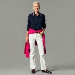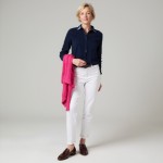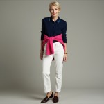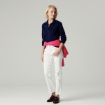 Blonde Woman in Navy Polo and White Jeans with Pink Sweater