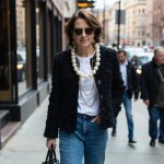 create a 40 year old women size 16 wearing black tween Chanel Jacket, white crewneck tee shirt, straight denim jean, with black loafer shoes, chunky gold jewelry of 2 chains and one strand of large oversized white pearls--walking down a city street. hair should be short and brown. She should look very chic and fashionable. No wrinkled clothes.