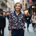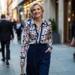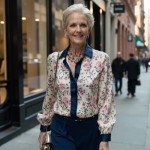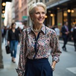 Elegant Woman Over 40 with Short Blonde Hair in Floral Blouse and Navy Palazzo Pants in City
