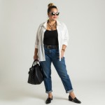 show head to toe shot. create a 40 year old women who is chic and fashionable. She should be pretty with a high pony tail. She is a PLUS size, wearing White button down cotton shirt worn open and tied at waist and over a black tank top that is tucked into her barrel cut jeans. She should wear chunky gold chains with one being a puffy heart. Give her a black belt. Shoes should be a loafer in black. She should carry a larger tote bag.