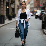 show head to toe shot but on a city street. create a 40 year old women who is chic and fashionable. She should be pretty with a high pony tail. She is a PLUS size, wearing White button down cotton shirt worn open and tied at waist and over a black tank top that is tucked into her barrel cut jeans. She should wear chunky gold chains with one being a puffy heart. Give her a black belt. Shoes should be a loafer in black. She should carry a larger tote bag.