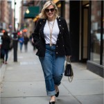 Plus Size Fashionable Woman in Chanel Jacket and Denim Jeans Walking in City