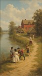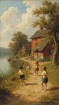 Barefoot Children Playing by River with Thatched Houses and Old Union Club