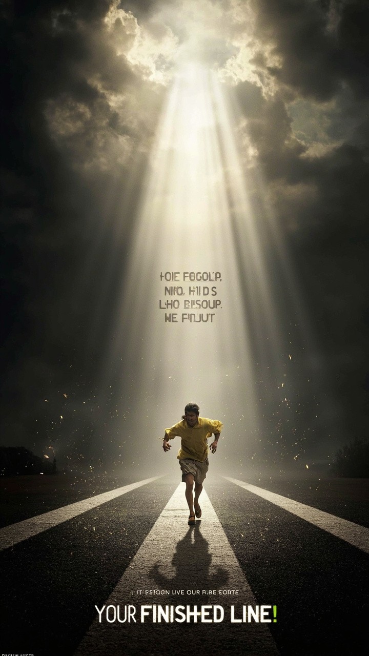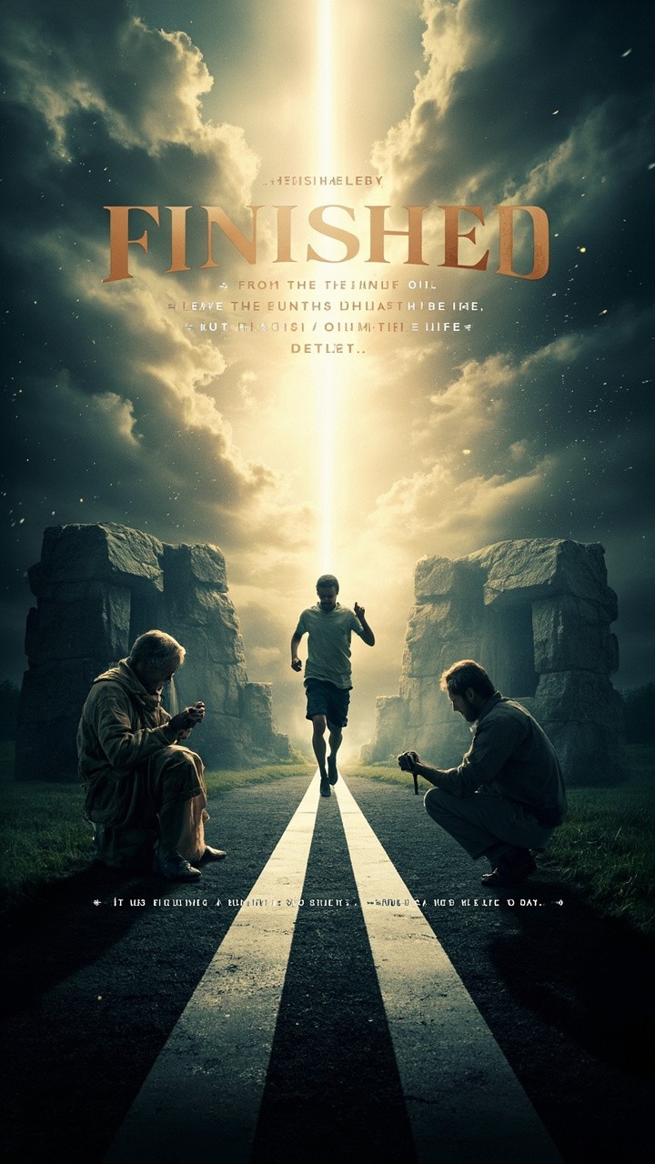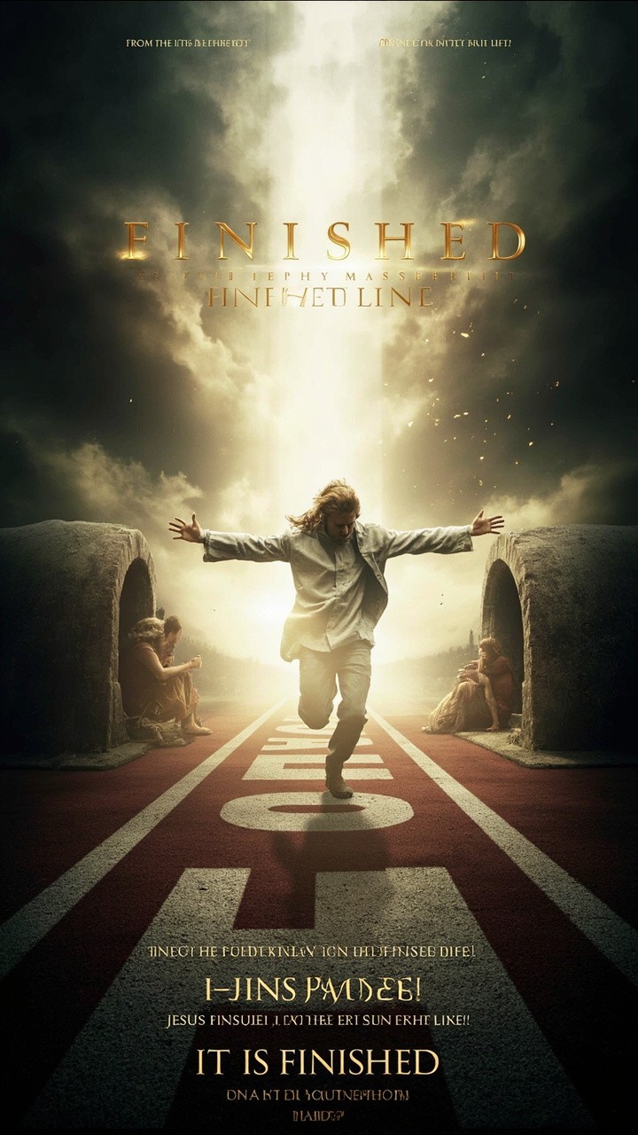 Create a 9:16 vertical YouTube Short, 30 seconds, Christian inspirational theme. Begin with Jesus on the cross shouting “It is finished!” with dramatic dark clouds and rays of light breaking through. Show the empty tomb with light streaming out, symbolizing resurrection and victory. Cut to a person in old, worn clothes kneeling, burdened, then praying and receiving Jesus into their heart, surrounded by soft light and subtle particle effects. The person stands in bright, new clothes, transformed, looking empowered and free. Show them running forward from a literal “FINISHED LINE,” leaving the past behind, symbolizing starting life from Jesus’ finished work. Overlay motivational text during the run such as: “From the FINISHED LINE… Into Your New Life!,” “Leave the Past Behind. Run From the FINISHED LINE!,” and “Jesus Finished It. Now Step Into Your Life!” End with text: “It Is Finished — Start Your New Life Today.” Keep the pacing dramatic, cinematic, uplifting, visually clear, and meditative yet energetic.