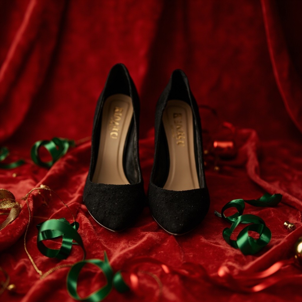 Elegant Black Women's Shoes on Red Velvet with Christmas Decorations