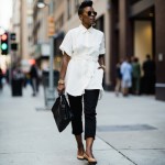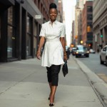 Over 40 Black Woman in White Mini Dress and Capri Pants in City Setting