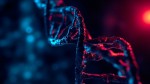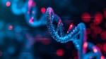 Neon Blue and Red Glitch Effect DNA Double Helix Close-Up