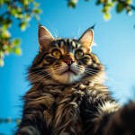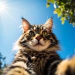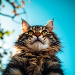 This is a close-up photo from an extremely low Angle, as if a furry tabby cat had accidentally captured it when taking a selfie below. The astonished and slightly comical face of this cat occupied the entire picture. Its wide and expressive eyes stared directly at the camera. Its long, luxurious fur is slightly disheveled, and its delicate whiskers spread out in a fan shape, very close to the camera, creating a humorous sense of distortion and warmth. The background is a bright blue sky. A few green leaves that are not in focus stick their heads out of the branches, suggesting the outdoor environment. The lighting was bright and natural, highlighting the texture of the cat's fur and its innocent, confused expression. This is a whimsical and interesting animal photo, capturing an unexpected moment with high detail and a strong playful personality. The photo is realistic.