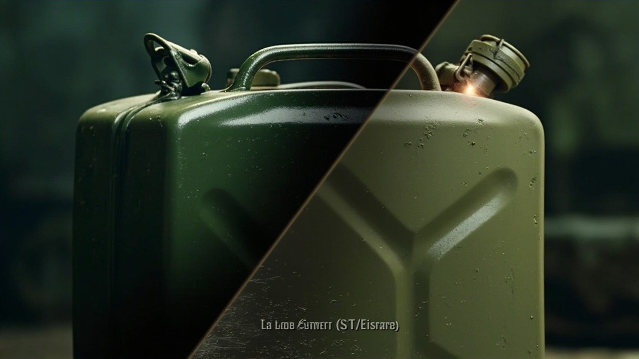 A split-screen thumbnail. On the left, a detailed, iconic German Wehrmachtskanister jerry can (dark green, three handles, distinctive cap) with a subtle glowing aura around its innovative features (e.g., the middle handle, the spout/cap area). On the right, a slightly worn, generic American military-style jerry can (olive drab, maybe two handles, simpler cap), with a subtle faded or broken effect on its corresponding features, suggesting a missed detail. A bold, contrasting diagonal line separates the two. Background is a blurred, stylized wartime or industrial setting. Colors are rich and muted, with emphasis on green and steel tones, and a clear, attention-grabbing title overlay (text not generated by AI, but conceptually placed). Focus on strong contrast, visual storytelling, and emphasizing the "genius" versus "missed" aspect. Ultra-realistic, cinematic lighting, 16:9 aspect ratio.