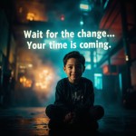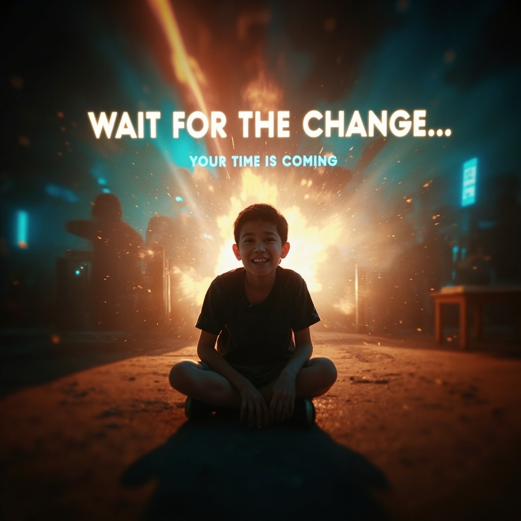 Create a 12-second cinematic vertical video. Scene starts with a young boy sitting alone in a dark room, looking sad. Suddenly, the lights flicker and the room transforms into a bright, colorful place. The boy looks at the camera and smiles confidently. Bold text appears: “Wait for the change…” then quickly changes to “Your time is coming.” Fast zoom, smooth transition, emotional background music, dramatic lighting, high quality, cinematic, viral YouTube Shorts style.