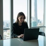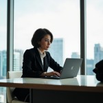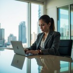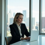 Confident Female CEO at Modern Desk in Sunlit Office, Skyline View