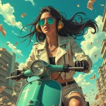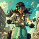 Anime-style illustration of a confident young woman riding a retro scooter in a post-apocalyptic urban landscape. She has long, flowing black hair blowing in the wind, wears oversized golden headphones and teal-tinted round sunglasses. Her outfit includes a futuristic white leather jacket with metallic details and black gloves. The vintage scooter is turquoise with scratches and a large round headlight. The sky is vivid blue with scattered paper debris flying around, and damaged buildings are visible in the background. Cinematic, dramatic angle from below, capturing motion and intensity. Ultra-detailed, stylized, vibrant, dynamic composition."