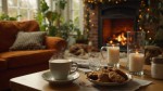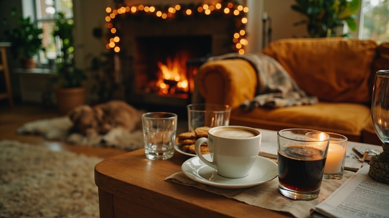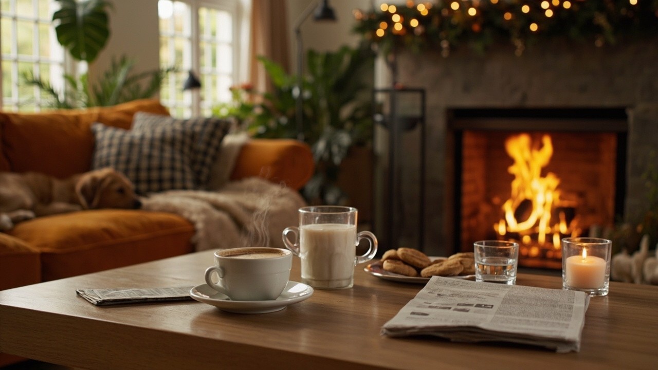 A cozy living room: a steaming cup of coffee sits on a smooth, wooden table, and next to it is a plate of cookies. In the background is a plush orange sofa with a checkered pillow. A dog is sleeping on a fluffy rug by the fireplace. Soft warm light from the garlands and fireplace creates a welcoming atmosphere. On the table there are glasses, coffee, a large candle in a transparent candlestick and a newspaper. There is a lot of greenery and light around. Dog on a blurred background.[статичный кадр]