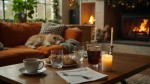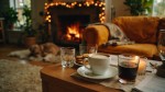 Cozy Living Room Interior with Coffee, Dog, Fireplace, and Greenery