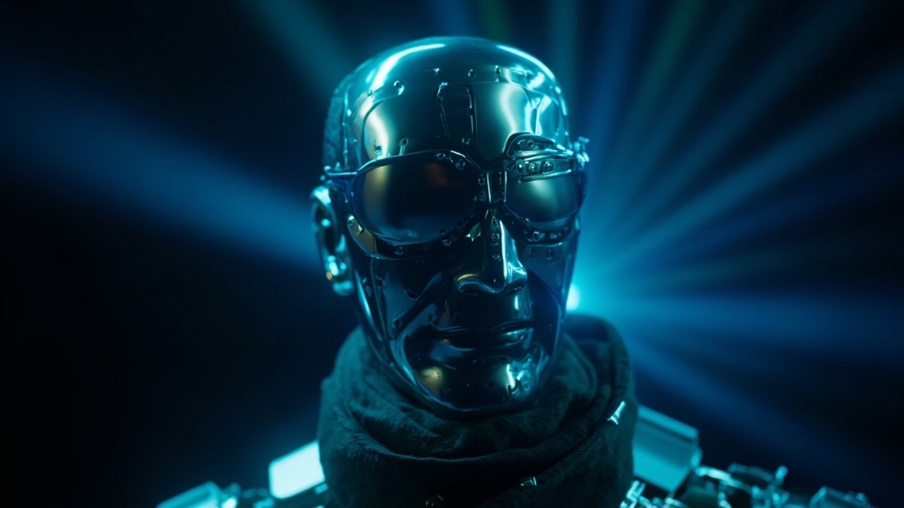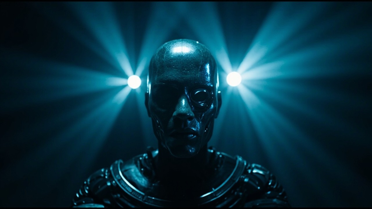 Generate 10-second seamless looping video, 16:9 4K, 30 FPS for techno VJ club performance. Dark industrial cyberpunk style, ultra high contrast, industrial palette ONLY: chrome silver, steel blue #1a3c5e, gunmetal gray #2a2a2a, cool white beams, deep cyan #0a4d68. NO bright colors. SUBJECT: Extreme close-up metallic cybernetic human head with chrome eye implant and circuit patterns, fills 95% frame, perfectly centered, front-facing, completely STATIC. BACKGROUND: Pure infinite black void #000000. LIGHTING: 8 industrial spotlights orbit head 360° with chaotic patterns: - 60% steel blue, 20% gunmetal, 15% cool white strobe, 5% cyan - Fast 130 BPM strobe, random flickers, L/R beam sweeps, size pulses, power surges, phase-shifted sines, rotation wobble, spark bursts - Heavy volumetric light rays through darkness MOTION: Head motionless. 0-3s subtle → 3-8s strobe chaos → 8-10s fade to match frame 1 (perfect loop). Camera: Fixed cinematic low-angle 8° up, f/2.2 DOF focus eyes. Output: MP4 H.264 alpha channel, "Techno_Cyberhead_VJ_01.mp4"