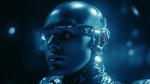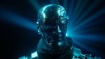 Cybernetic Human Head with Chrome Eye Implant in Steel Blue Spotlight