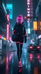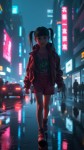 Animated Cyberpunk Girl with Neon Hair in Rainy Futuristic City