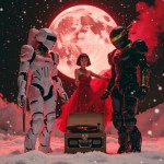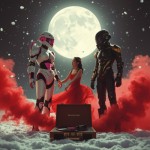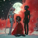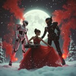 Cyborg Robots and Girl in Snowy Moonlit Scene with Vinyl Record Player