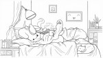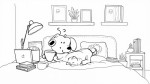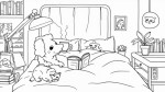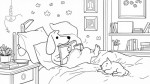 A coloring page of an illustration in a cartoon style, with a thick black outline drawing. A dachshund is lying on the bed, reading a book under a reading lamp while holding a steaming cup of tea. The room has some books, plants, pillows, a laptop, a kitten is curled up sleeping on the bed. The walls have pictures hanging in frames. There's also a small desk by their side that contains various items, such as stationery or game boxes. The background is simple and white, with no shadows or color, and low detail. Style of Coco Wyo cozy friends