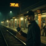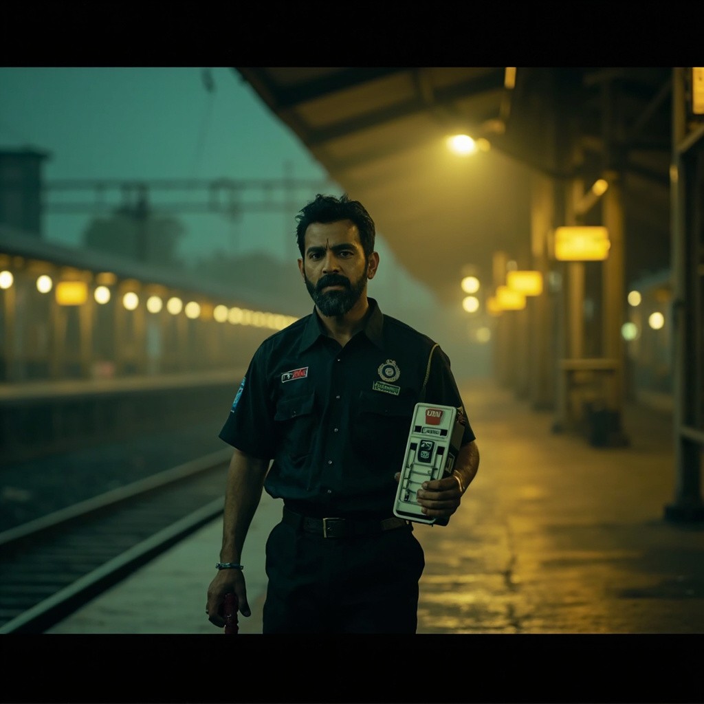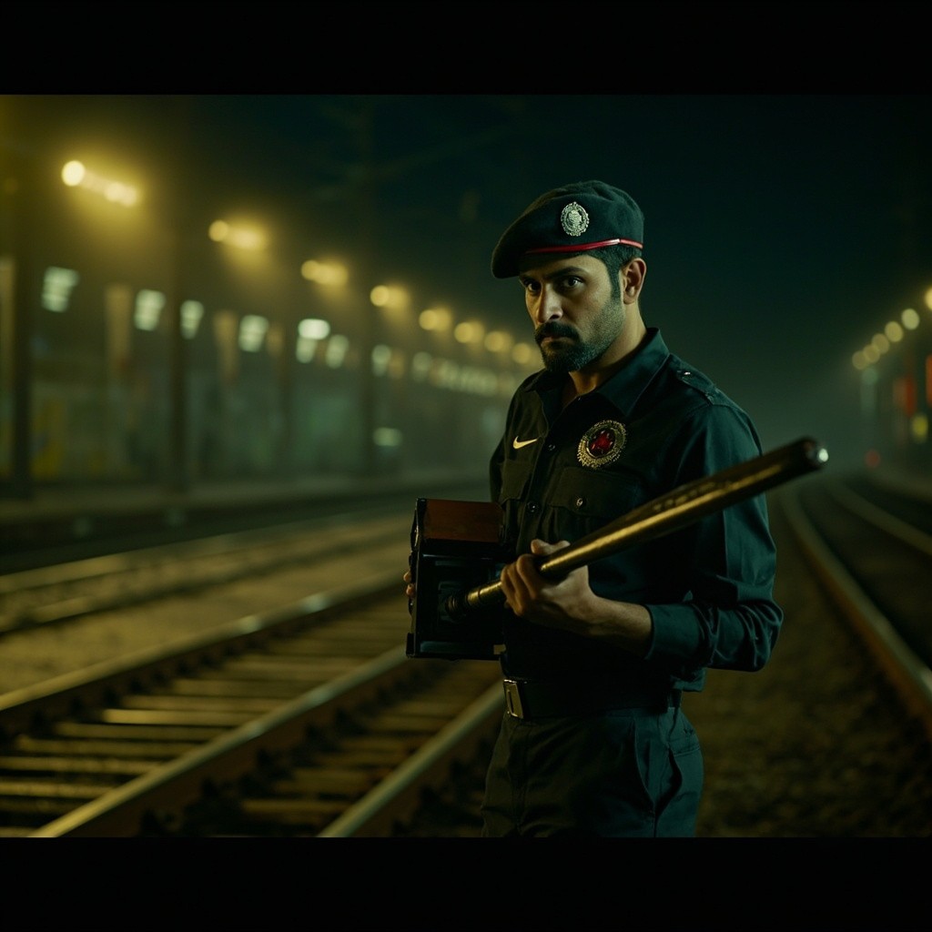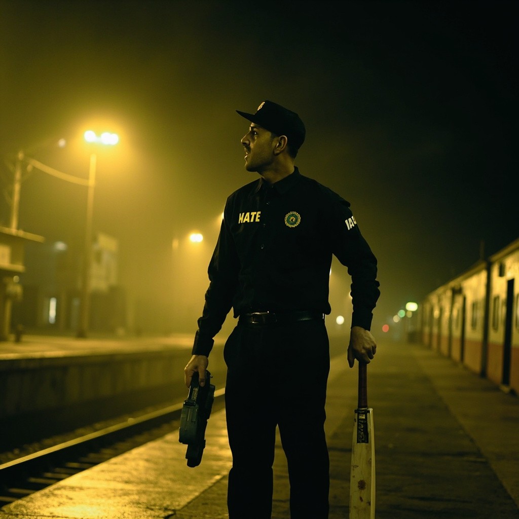 Opening Hook – “Ticket Collector to World Champion” Prompt: Ultra-realistic cinematic vertical shot of a young Indian man resembling MS Dhoni standing alone on an empty railway platform at night in Ranchi, wearing a black TTE uniform, holding ticket punch machine in one hand and a cricket bat in the other, soft yellow station lights, slight rain mist in air, shallow depth of field, dramatic shadows, emotional expression, India small-town vibe, 9:16 aspect ratio, cinematic color grading, high contrast, inspirational tone.