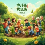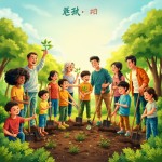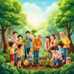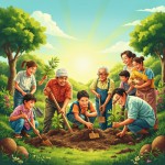 “A diverse group of people of all ages, ethnicities, and body types planting trees together in a vibrant, green outdoor setting. The scene shows children, adults, and elderly individuals working side by side with joy and purpose. The sky is clear, the sunlight is warm, and the atmosphere radiates hope and unity. Some people hold shovels, others carry saplings, while others water young trees. The environment is natural and lush, symbolizing sustainability and collective action. Emphasis on diversity, collaboration, and a positive future for the planet.”