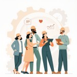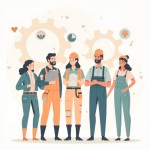 Minimalist Illustration of Diverse Industrial Workers with Clipboards and Background Gear Shapes