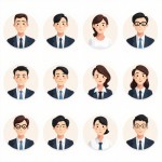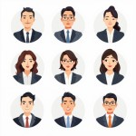 "A collection of professional user avatar portraits in clean vector illustration style. Each avatar represents a corporate or business professional — men and women in formal or semi-formal attire (blazers, shirts, blouses, ties). Include diverse ethnicities, facial features, and hairstyles to reflect global workforce diversity. Style should be modern, minimal, and flat with soft gradients, smooth outlines, and neutral color tones (navy, gray, white, beige, muted blues). Each avatar should be inside a circular frame with a subtle white or light gray background. Avoid exaggerated expressions or cartoonish elements — keep it suitable for LinkedIn-style profiles or enterprise software