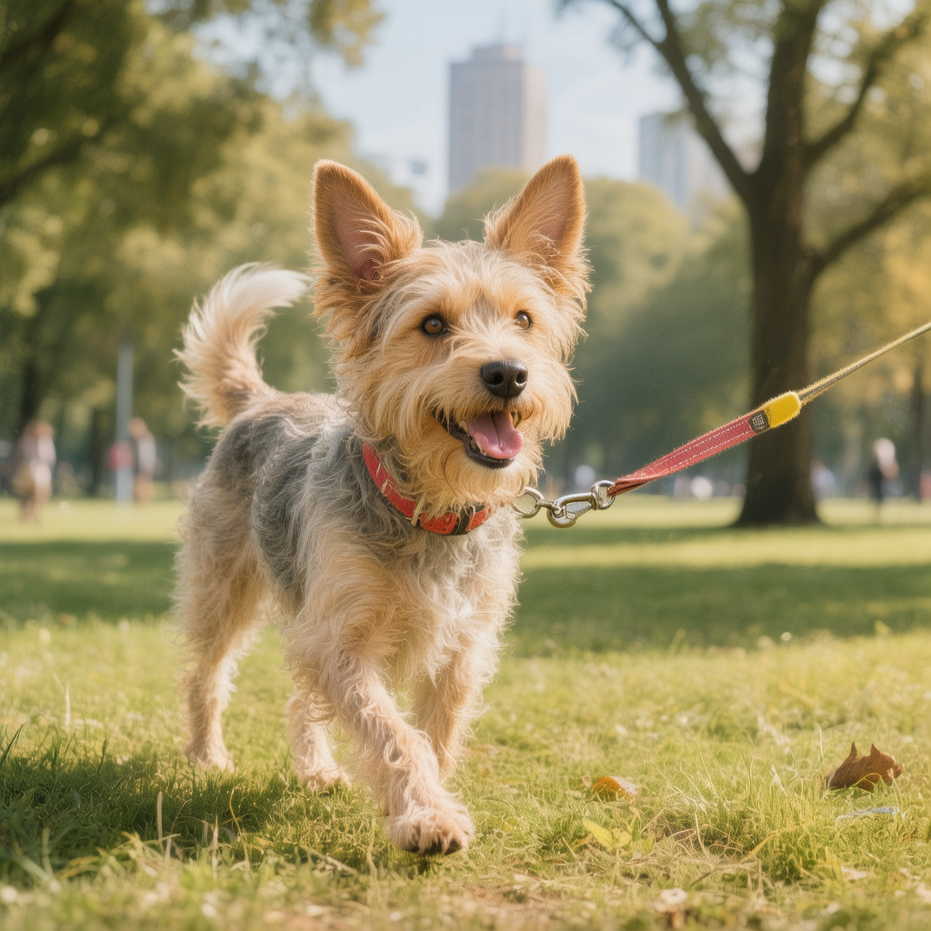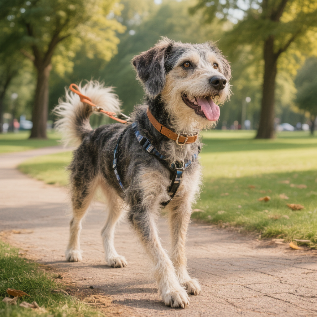 A joyful dog walking in a beautiful park setting.