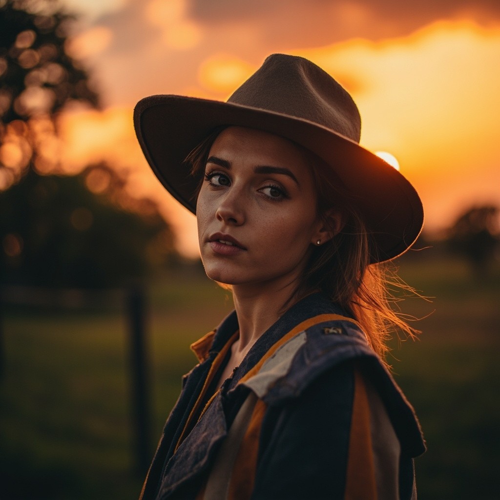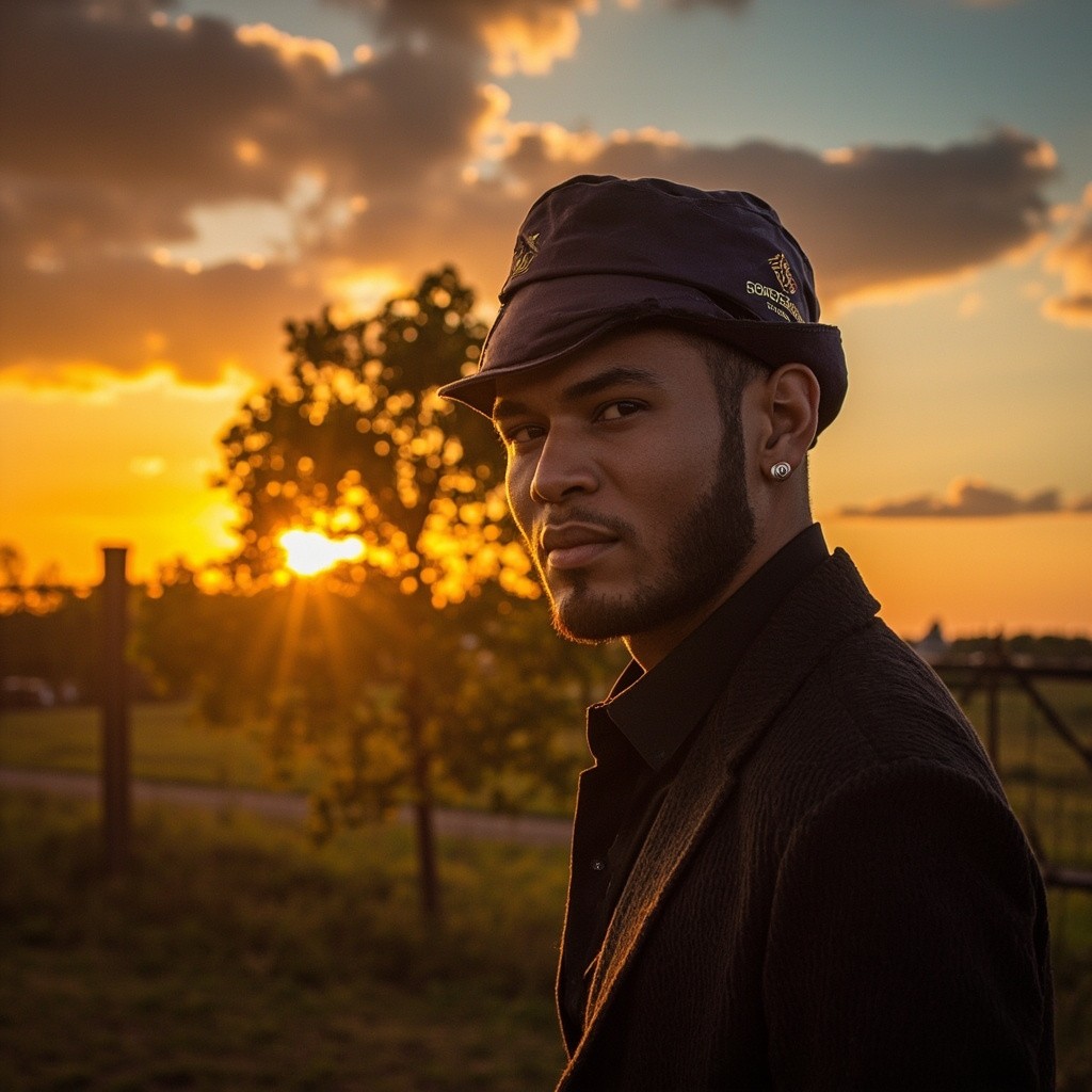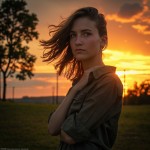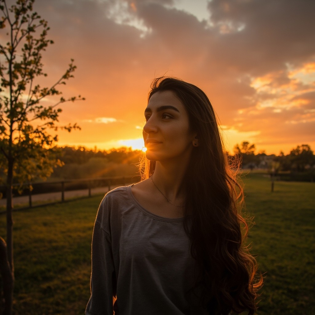 Transform this image into a dramatic sunset HDR style while preserving 100% of the original content. Do NOT change, add, remove, replace, or distort any object, subject, tree, fence, grass, sky, or background. Maintain the exact same composition, framing, perspective, camera angle, subject position, shapes, and proportions. Apply photorealistic sunset lighting with warm golden-orange tones in the sky and subtle soft shadows on the subject’s face and clothes. Enhance dynamic range naturally. Colors must look realistic, not oversaturated, not artificial. No fantasy effects, no extra clouds, no extra sun, no lens flares, no fog, no rain unless already present. This is strictly a realistic color and lighting transformation only. The original image must remain perfectly recognizable.
