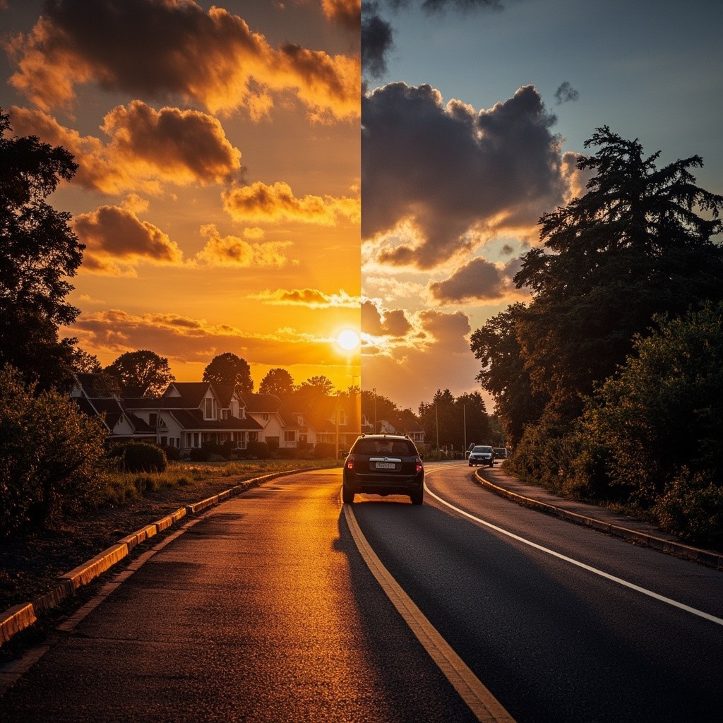 Transform this image into a dramatic sunset HDR style while preserving 100% of the original content. Do NOT change, add, remove, replace, or distort any object, subject, animal, person, building, tree, road, shadow, reflection, or background. Maintain the exact same: composition framing perspective w.compcation.foming camera angle subject positions shapes and proportions Colors must look realistic, not oversaturated, not artificial. No fantasy effects, no extra clouds, no extra sun, no lens flares, no fog, no rain unless already present. This is a strict color and lighting transformation only. Photorealistic sunset HDR edit. Original image must remain perfectly recognizable