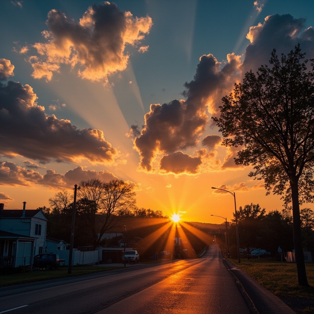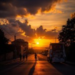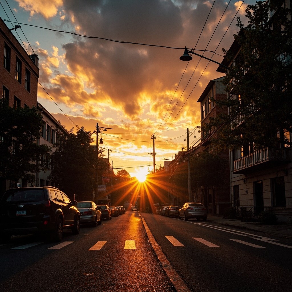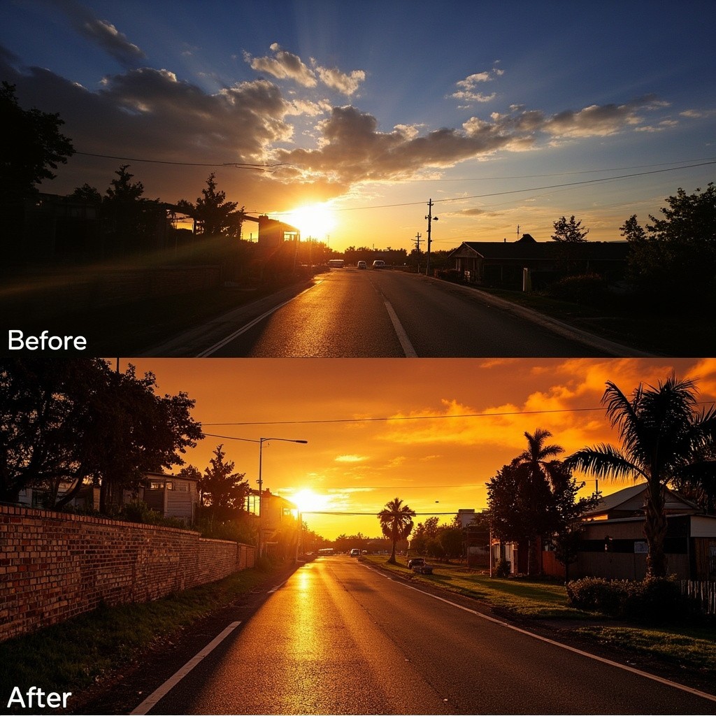 Transform this image into a dramatic sunset HDR style while preserving 100% of the original content. Do NOT change, add, remove, replace, or distort any object, subject, animal, person, building, tree, road, shadow, reflection, or background. Maintain the exact same: composition framing perspective w.compcation.foming camera angle subject positions shapes and proportions Colors must look realistic, not oversaturated, not artificial. No fantasy effects, no extra clouds, no extra sun, no lens flares, no fog, no rain unless already present. This is a strict color and lighting transformation only. Photorealistic sunset HDR edit. Original image must remain perfectly recognizable