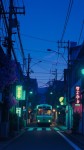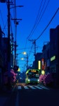 "A dreamy Tokyo street at dusk, glowing in deep blue twilight. The narrow road is lined with pink azalea bushes in full bloom on one side, and small buildings and signboards on the other. A green and white city bus is crossing an intersection under a tangle of electric wires overhead. Neon signs in Japanese softly glow in yellow and green. The sky is a vibrant cobalt blue with no clouds, casting a surreal, almost anime-like ambiance. Street lamps and traffic lights emit a faint warm light. The overall mood is calm, nostalgic, and cinematic, as if captured from a scene in a Studio Ghibli or Makoto Shinkai film."