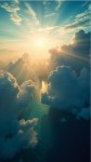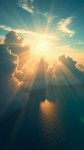 A breathtaking, surreal view from above the clouds, capturing a dramatic sky during golden hour. Thick, fluffy clouds tower upwards like majestic mountains, lit warmly by the setting sun. The sunlight reflects on the turquoise-blue ocean below, casting shimmering highlights across the water. The sun is glowing intensely with radiant beams spreading across a deep blue sky filled with wisps of cirrus clouds. The scene evokes a sense of peace, wonder, and elevation — like floating in a dreamworld above Earth. Ultra-realistic, 8K resolution, cinematic lighting, magical and serene atmosphere."