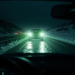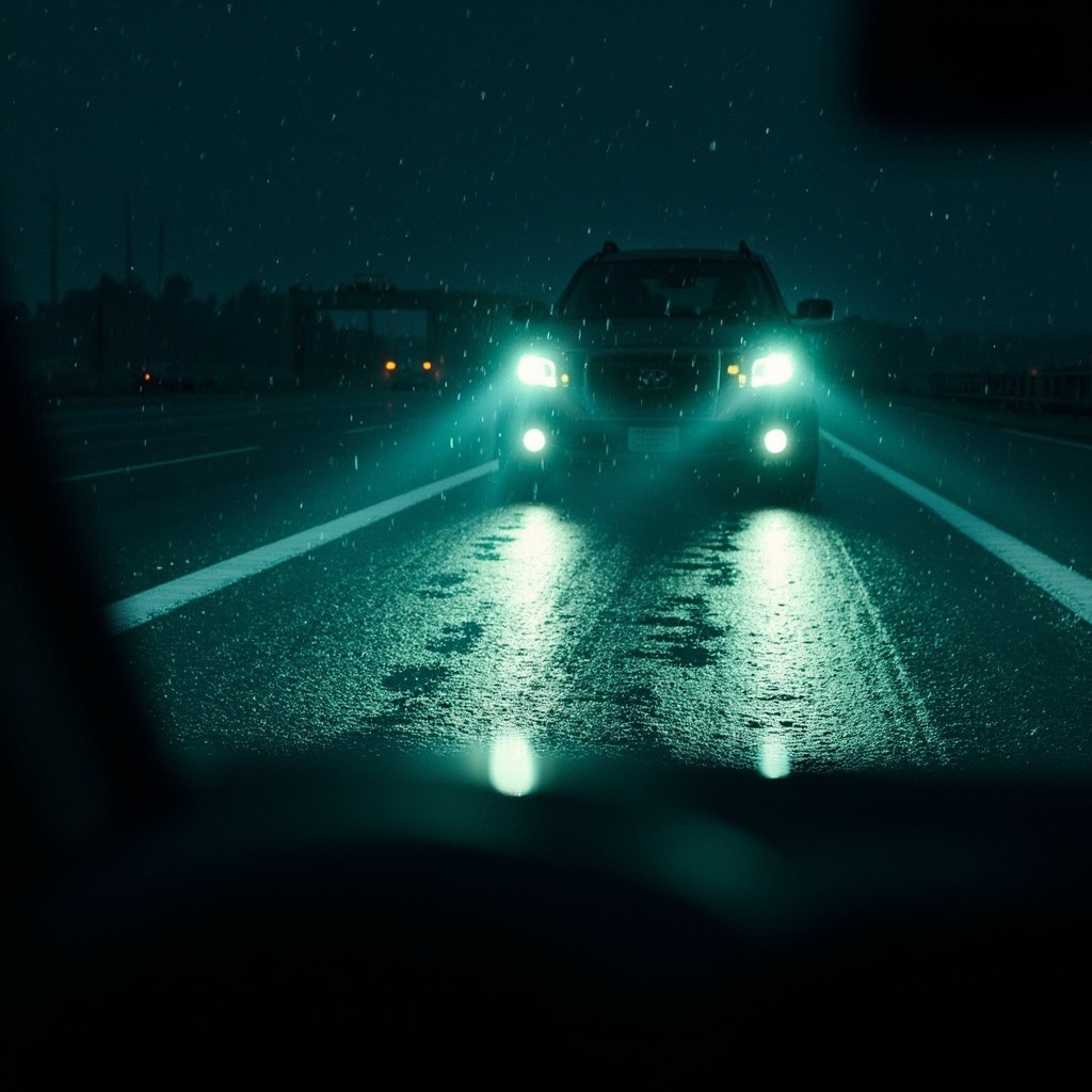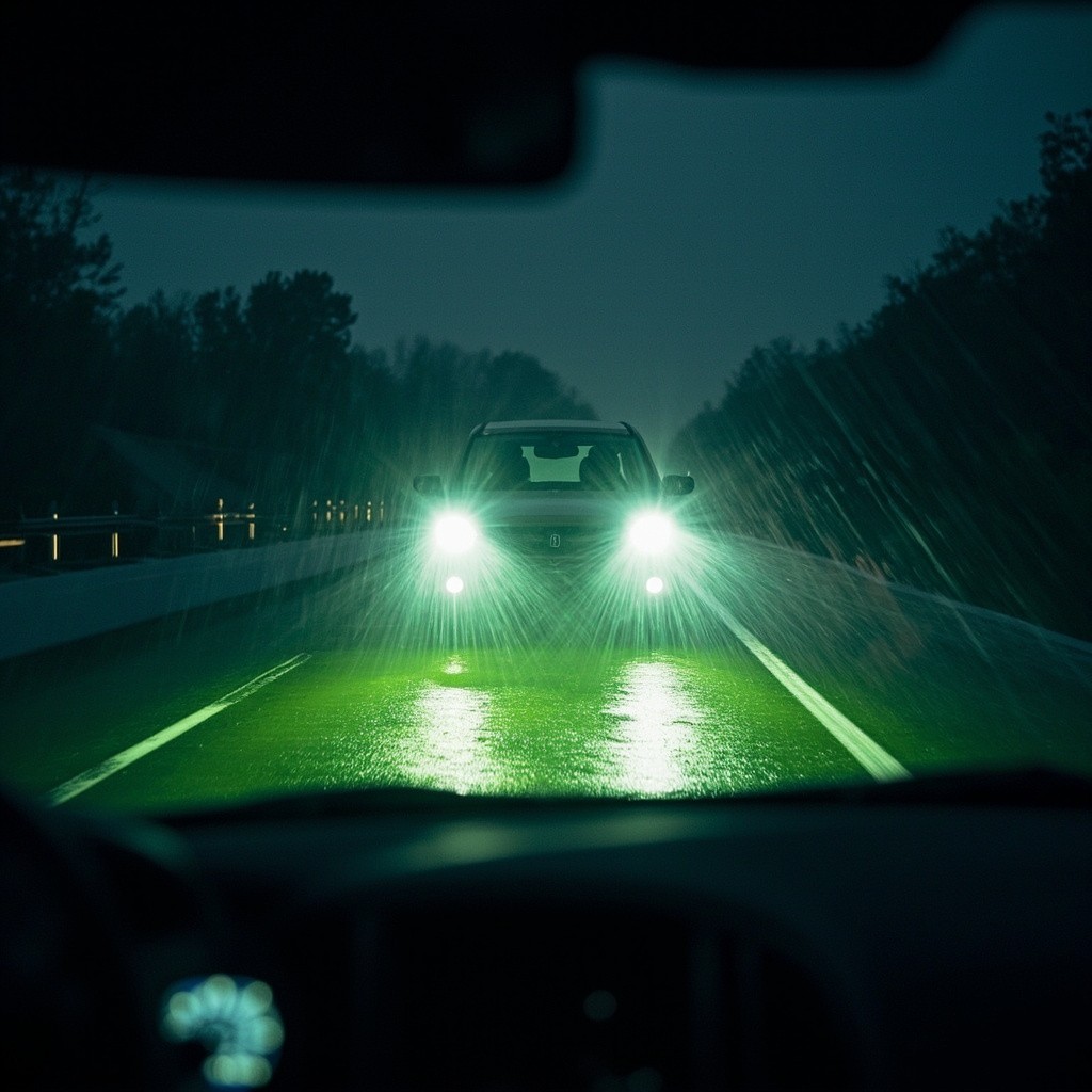 First-Person View of Illuminated Wet Road During Rain with Lime Green Fog Lights
