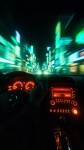 Third-person cinematic view from inside a car cockpit as it speeds through a vibrant Tokyo street at night. The dashboard glows with orange instrument lights, showing detailed gauges and radio controls. Outside, the neon-lit cityscape glimmers in green and blue tones, with blurred traffic and glowing advertisements creating a sense of motion. The scene feels like a fast-paced video game, captured from the driver’s perspective, hands on the wheel. The mood is energetic and cinematic with a cyberpunk aesthetic and rich nighttime colors.