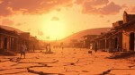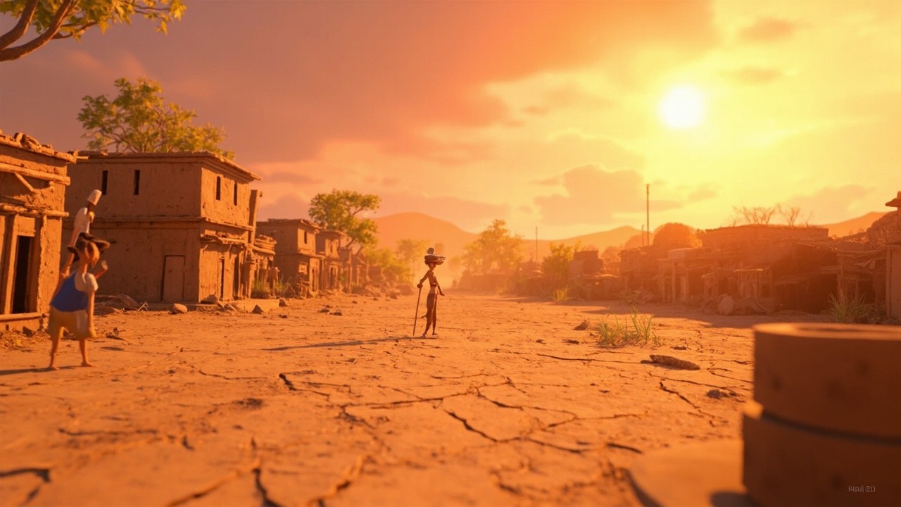 3D cartoon Pixar-style illustration of an Indian village facing drought, cracked dry land, empty fields, broken mud houses, villagers looking worried, no water in wells, hot sunlight, dramatic rural atmosphere, cinematic lighting, wide shot, soft pastel colors, emotional storytelling, ultra-detailed 4K