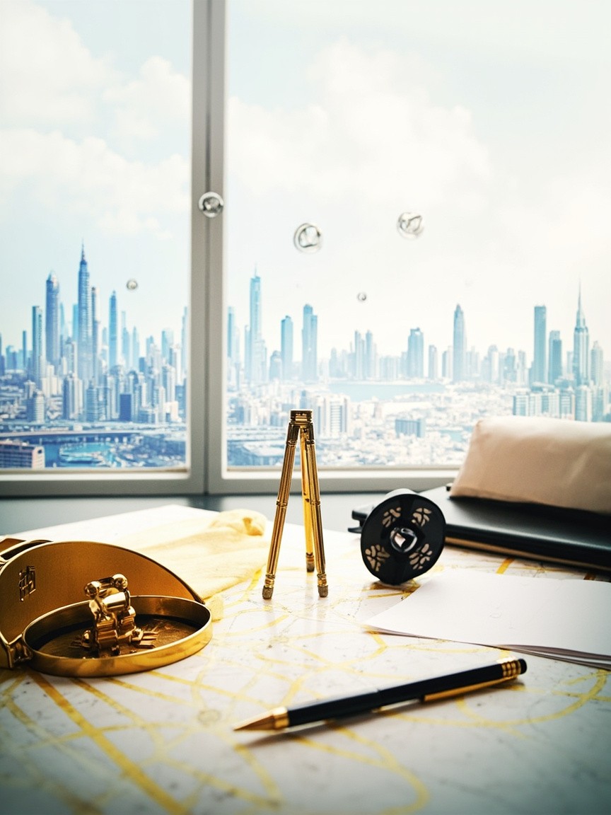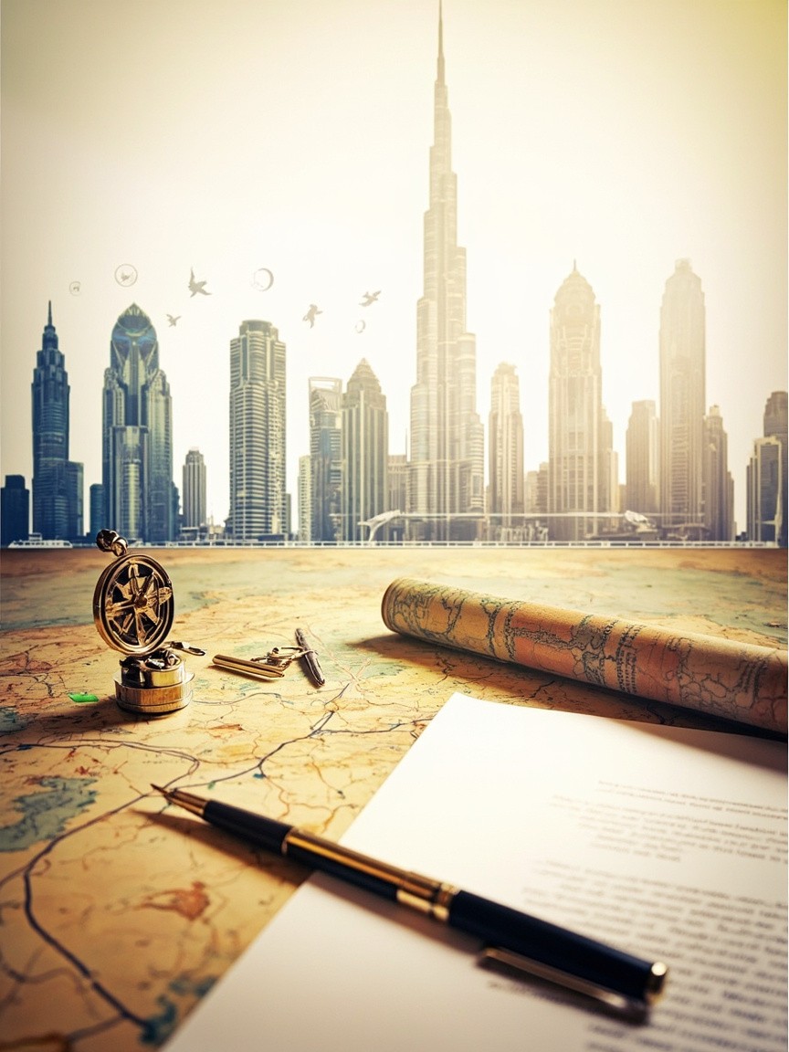 Dubai Skyline with Compass and Map Icon on Luxury Table