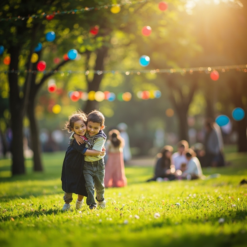 عید آئی، خوشی لائی 🎉 پارک میں سب کو ملائی 🤝 گلے لگو اور مسکراؤ 😊 محبت سب میں پھیلاؤ عید کی صبح کا خوبصورت منظر، پارک میں ہری گھاس، درختوں پر رنگ برنگی لائٹس اور غبارے، لوگ ایک دوسرے کو گلے لگا کر “عید مبارک” کہہ رہے ہیں۔ بچہ خوشی خوشی بھاگتا ہوا آتا ہے، اپنے دوست یا کسی بڑے کو گلے لگاتا ہے، پھر کیمرے کی طرف دیکھ کر مسکرا کر عید مبارک کہتا ہے۔ ہلکی دھوپ، نرم سلو موشن، پس منظر میں بچے کھیل رہے ہوں، فیملی بیٹھ کر باتیں کر رہی ہو۔