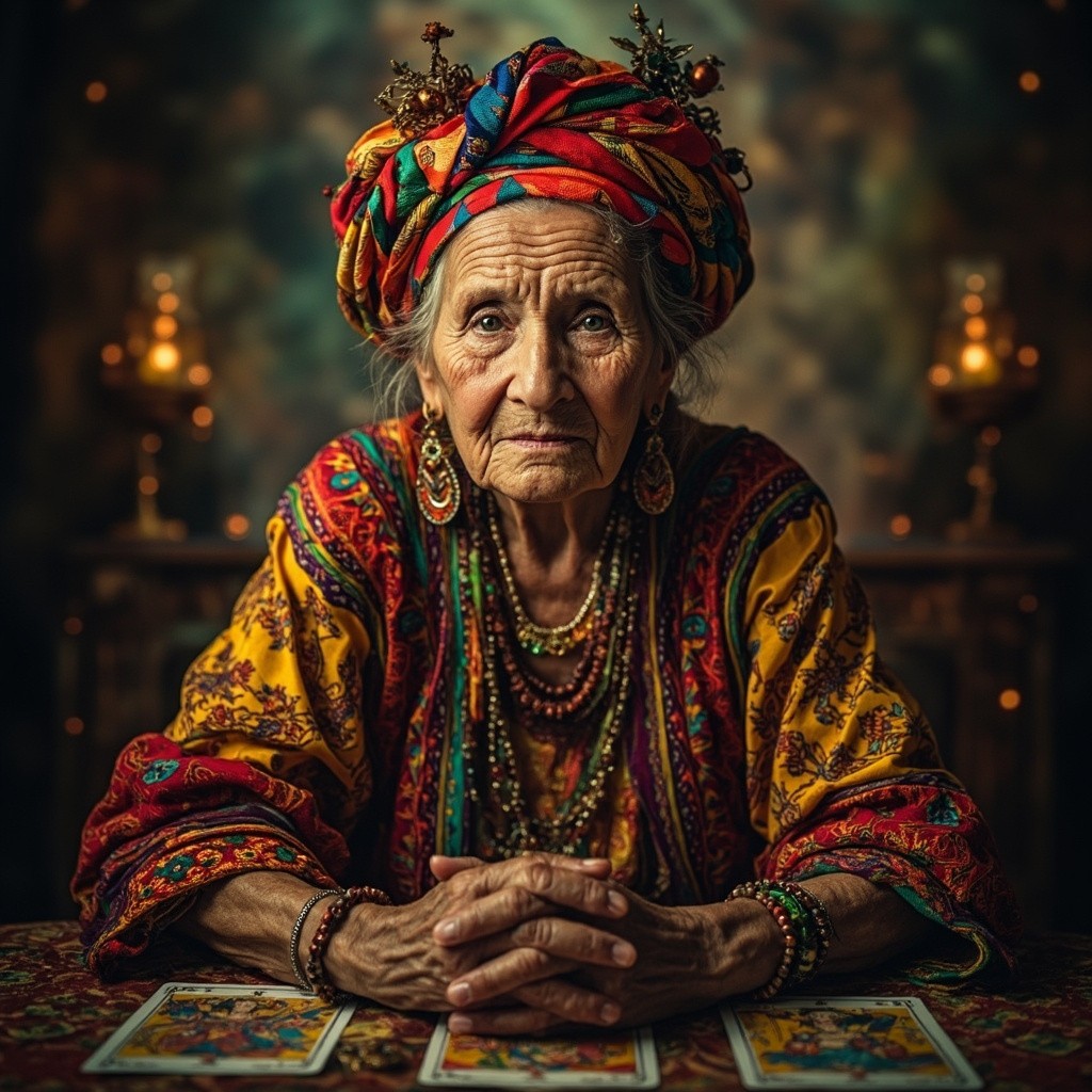 "An elderly Brazilian woman, around 80 years old, in the mystical style of a tarot reader and fortune teller. She is standing directly in front of the viewer, making deep, intense eye contact, with an expression full of wisdom and mystery. She wears traditional Brazilian clothing with vibrant, eye-catching patterns: colorful lace, a wide flowing skirt, bright blouses, and handmade jewelry. Her outfit is extravagant, with vivid colors like red, yellow, and green, creating a striking and impactful presence. She has a colorful headscarf or turban adorned with traditional Brazilian accessories. Her face is beautifully aged, with expressive wrinkles that tell a story of strength and experience. Her calloused hands rest on a table spread with tarot cards. The background is mystical, with soft glowing lights and a spiritual aura surrounding her. Artistic style: hyper-realistic, with rich textures and colors, dramatic lighting, and a mystical atmosphere."