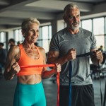 Depict an elderly couple in a realistic style, engaged in progressive strength training at a gym - exercises with resistance bands, their faces radiating energy and focus. The fit elderly woman stands confidently, showcasing her athletic physique with toned arms holding a resistance band. The blonde woman has short cropped hair. She wears a smooth, form-fitting orange sports bra paired with bright turquoise high-waisted leggings that highlight her curves. The elderly athletically-built man stands confidently, displaying a well-defined physique with broad shoulders and a narrow waist. He is dressed in a snug gray t-shirt that clings to his muscular torso, emphasizing his toned arms with the resistance band, and sports shorts that fall just above the knee, allowing for ease of movement. In the background is a modern gym.