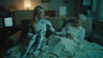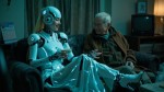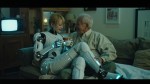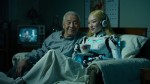 Korean Female Robot on Sofa with Tea and Elderly Chinese Man in Bedroom
