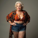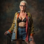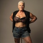 Elderly Plus-Size Woman in Mixed Color Bra and Jeans Posing Stylishly