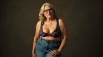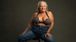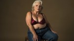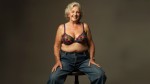Elderly Plus-Size Woman Modeling in Bra and Jeans