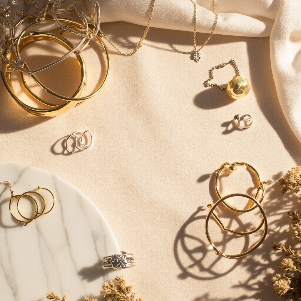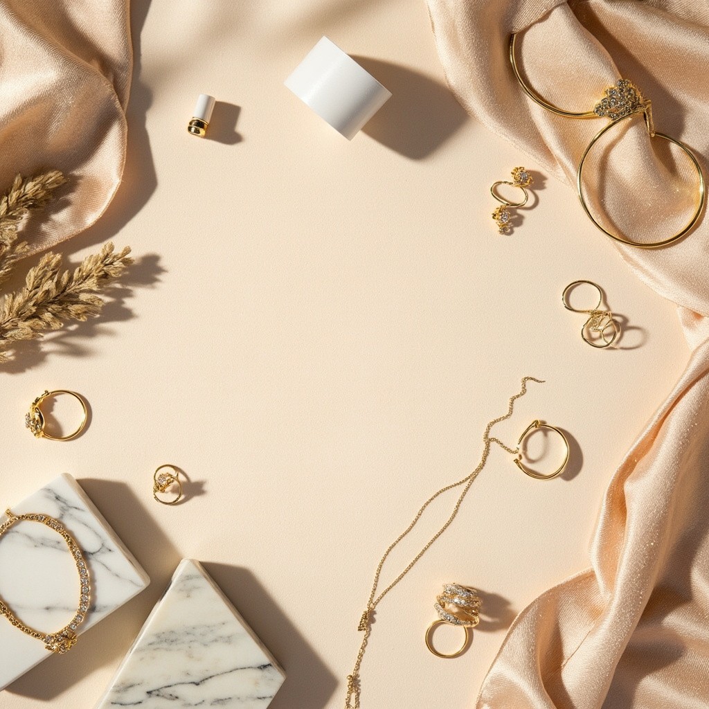 A luxurious and elegant cover image for an online artificial jewellery brand, featuring premium gold-plated and silver-toned artificial jewelry including necklaces, earrings, bangles, rings, and chokers. The jewelry is beautifully arranged on a soft neutral background with subtle fabric textures like silk or velvet. Soft studio lighting highlights the shine and fine detailing of the jewelry without excessive sparkle. A modern yet classic aesthetic with warm tones, refined shadows, and a clean premium look. Minimalistic composition with empty space for brand name text, Instagram-ready cover style, high-end fashion branding, elegant, timeless, and visually striking. Ultra-high resolution, sharp focus, professional product photography, luxury jewelry brand vibe. with clean aesthetic, trendy flat-lay, stylish props like marble, dried flowers