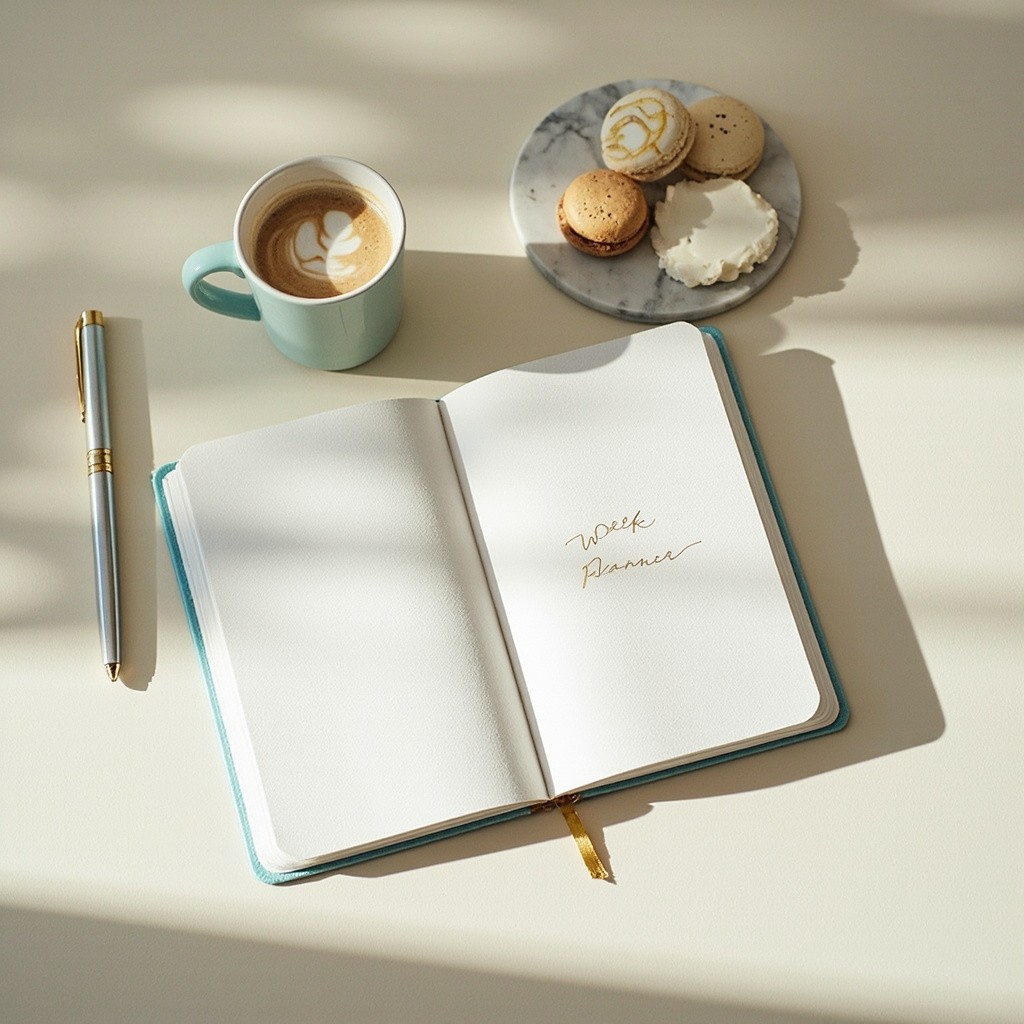 A high-end, minimalist flat lay composition from directly above. In the center, an open, elegant journal with fine linen texture and gold-foil writing that subtly says 'Week Planner'. Next to it, a ceramic mug with latte art, a few gold-and-white macarons on a marble coaster, and a tasteful, vintage-style pen. The color palette is soft cream, pastel blue, and touches of gold. Natural, soft sunlight from the side, creating long shadows.” 9.16