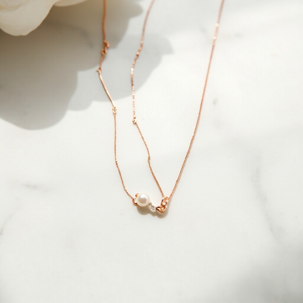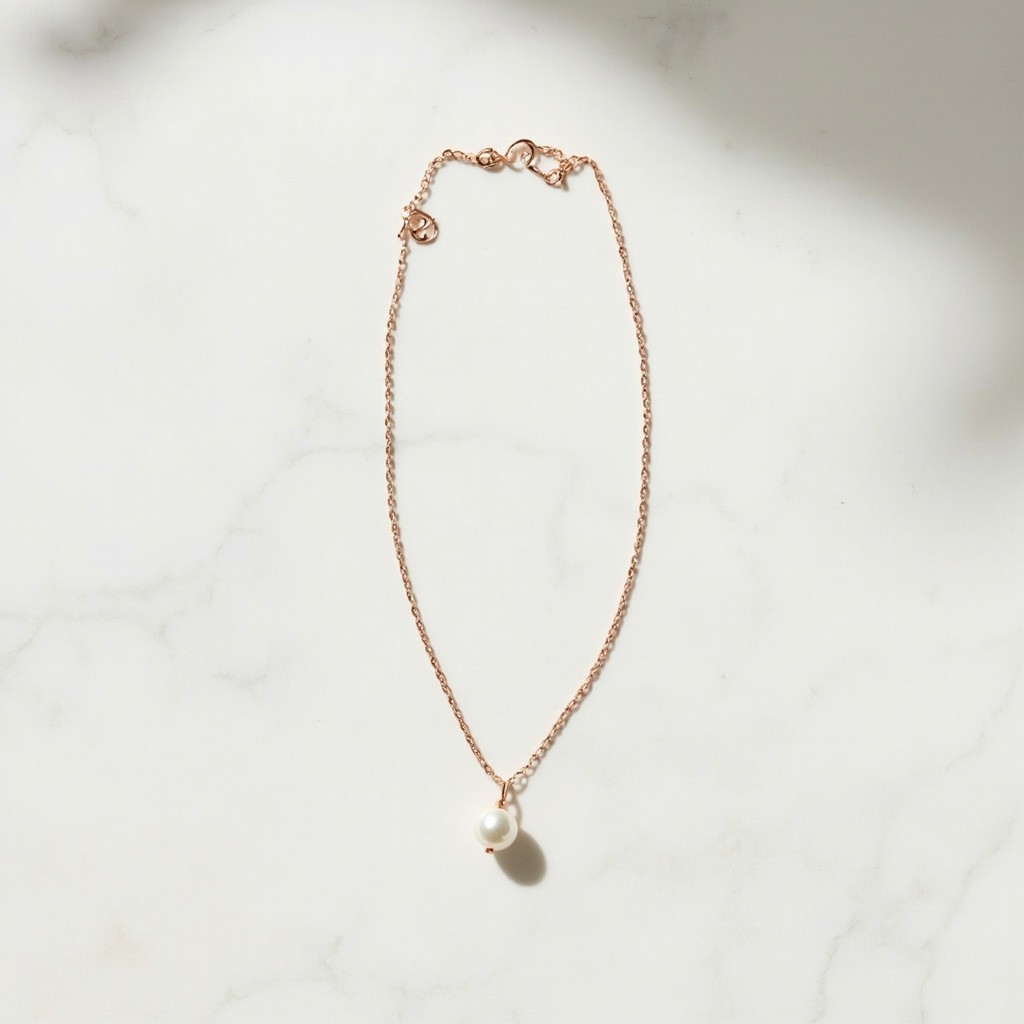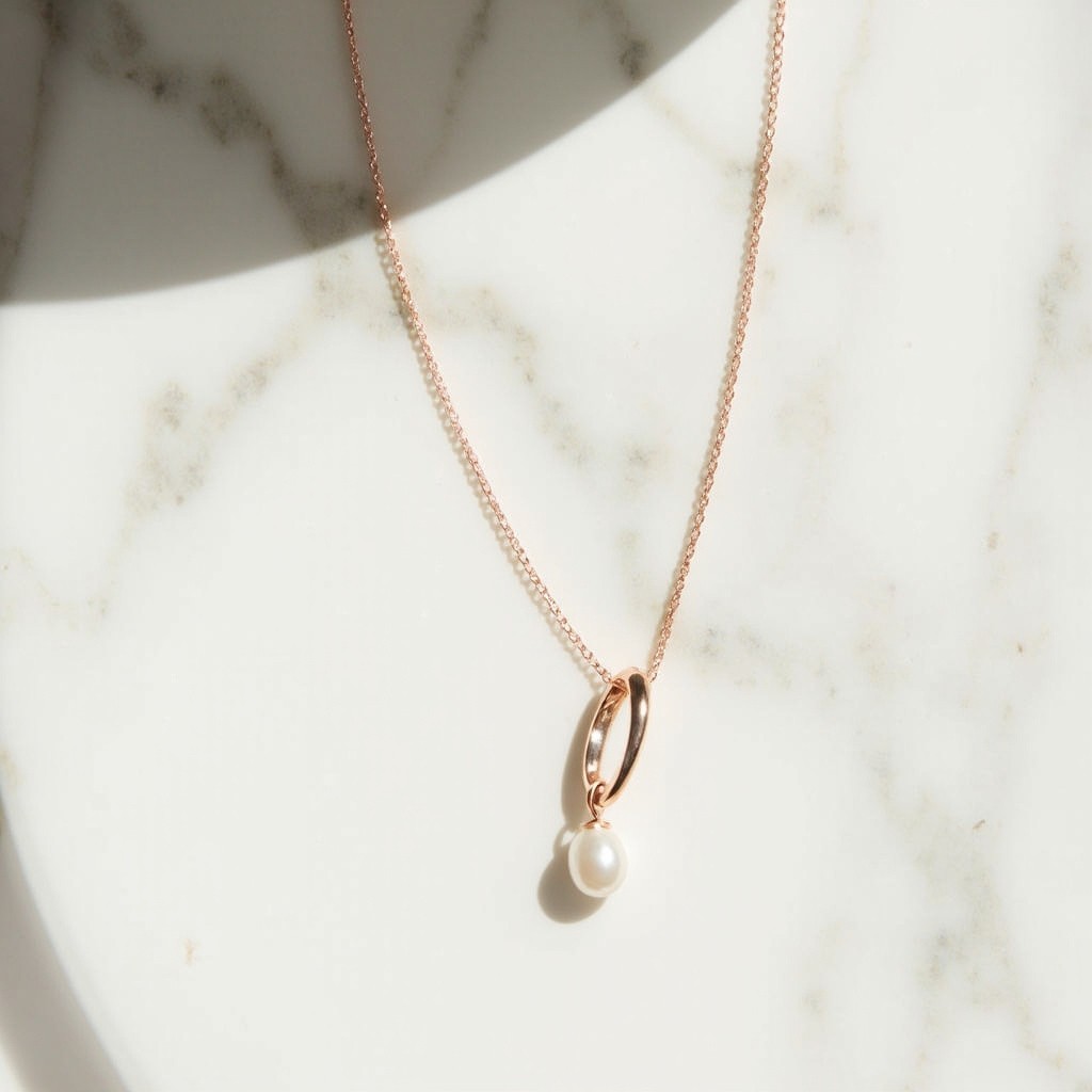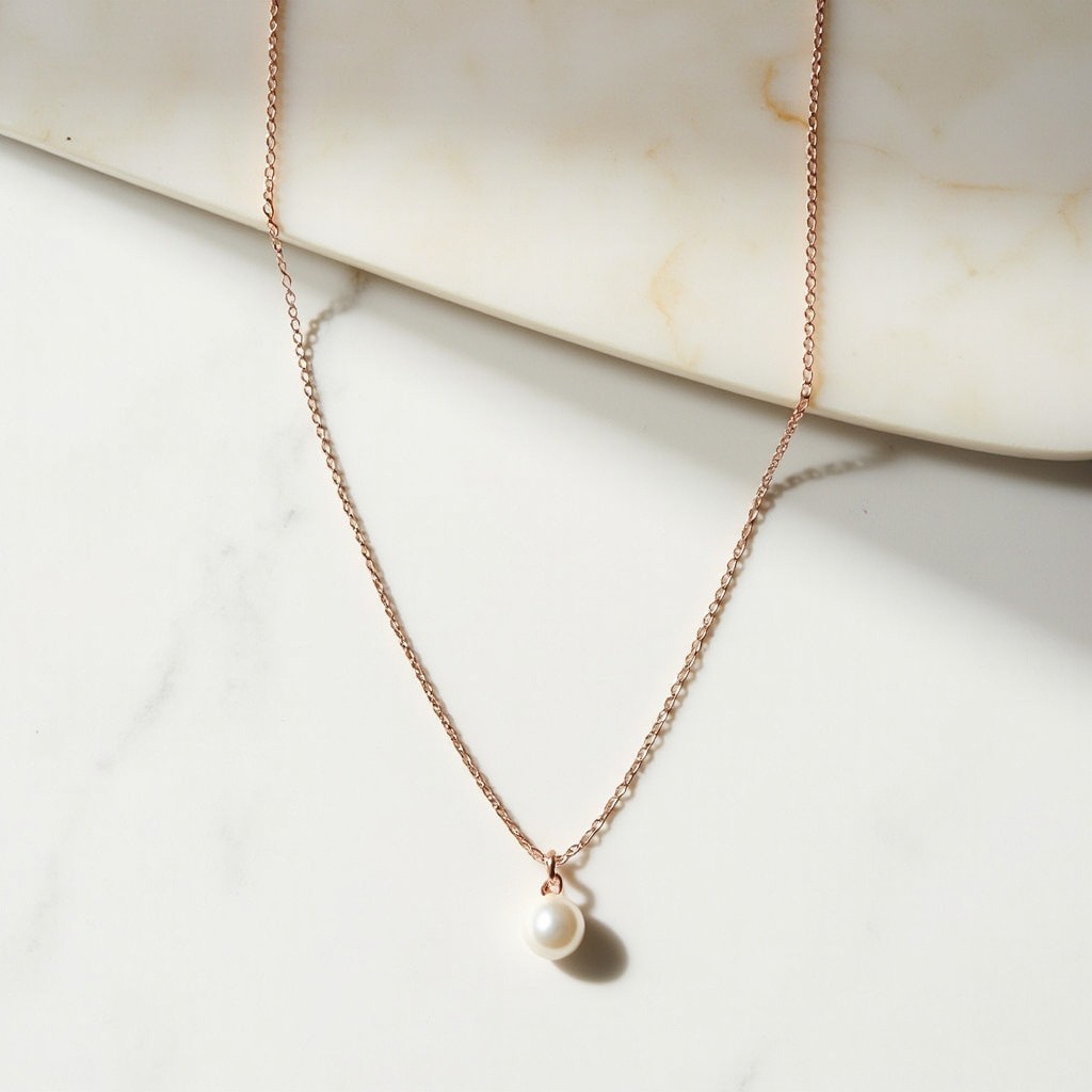 Top View of Minimalist Rose Gold Necklace with Pearl Pendant on White Marble Background