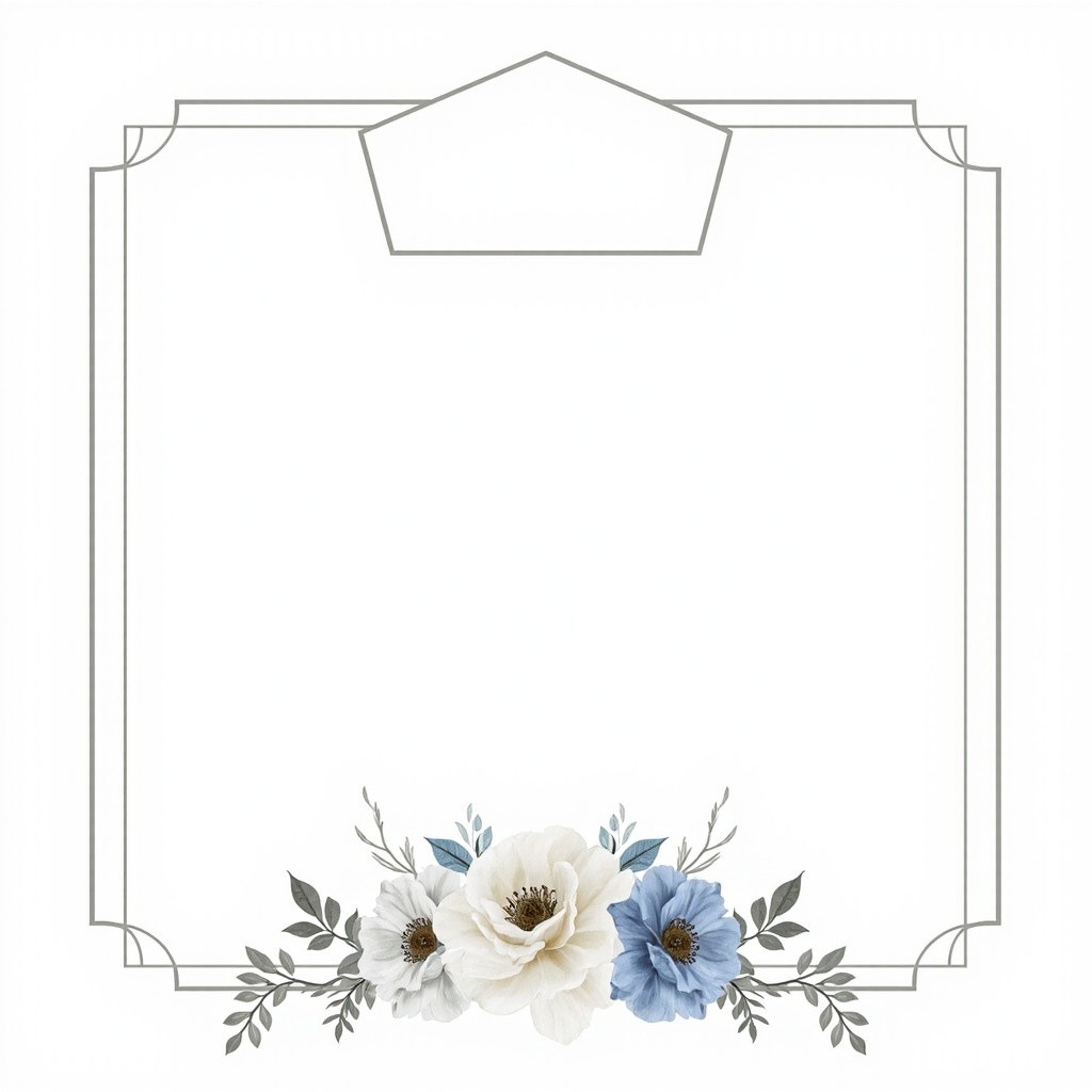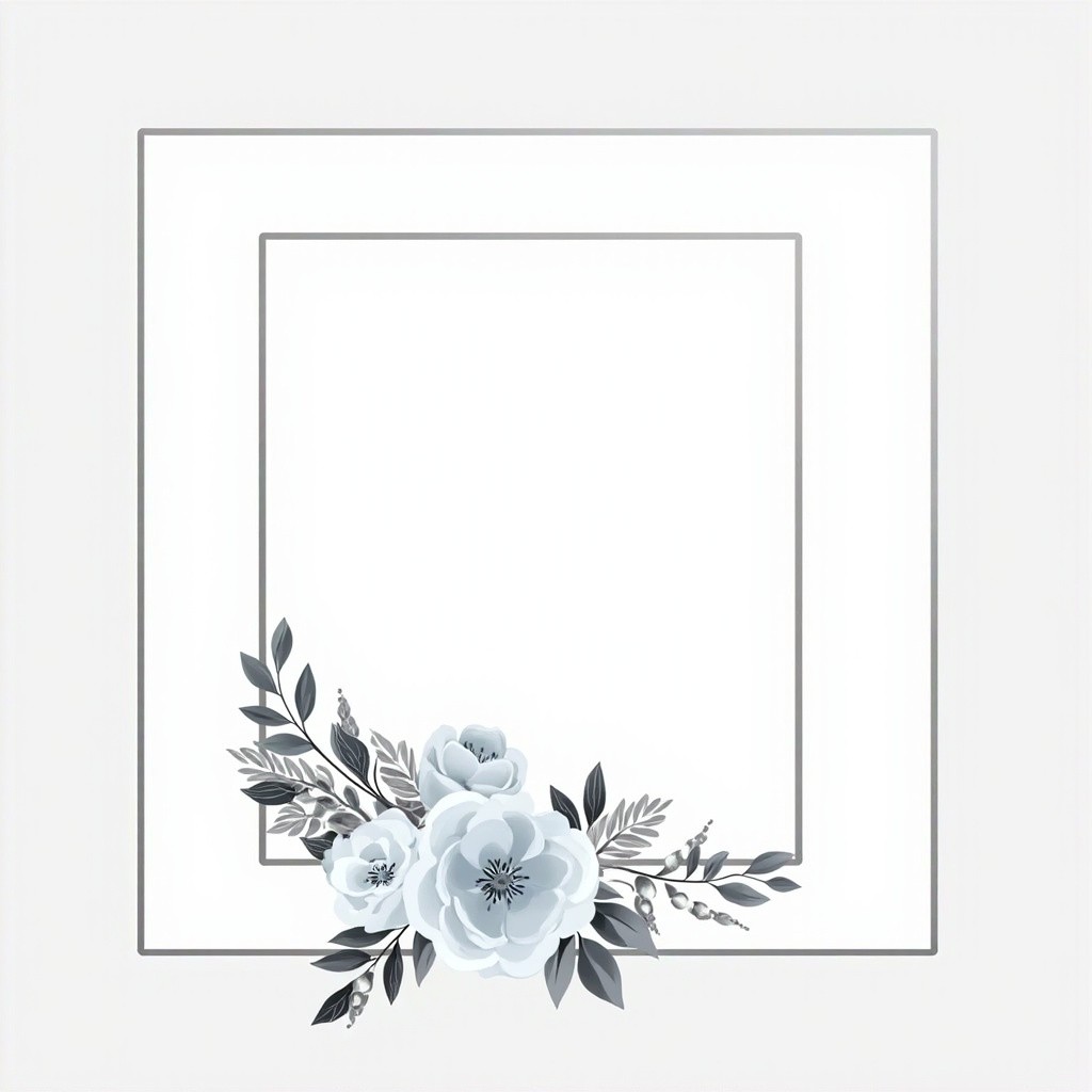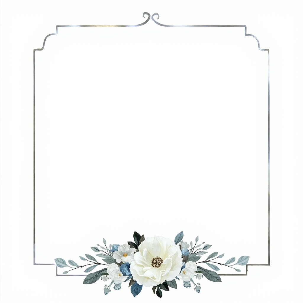 You are an experienced graphic designer specializing in wedding invitations, with a keen eye for visual aesthetics and a mastery of color coordination. I request your expertise to design an elegant wedding invitation frame with the following specifications: A silver frame to elegantly surround the invitation content. The frame should be a simple line. A rectangular shape with a rounded top edge should serve as the main text area. An elegant floral arrangement should fill the bottom of the frame, using harmonious colors of white, silver, light blue, and gray. The final design should be delivered in high-quality PNG format with a transparent background for multiple uses. The overall design should reflect sophistication, balance, and beauty, befitting a formal wedding invitation. Please utilize your advanced design skills and deep understanding of wedding aesthetics to produce a visually appealing and meticulously crafted invitation frame that meets these detailed criteria.